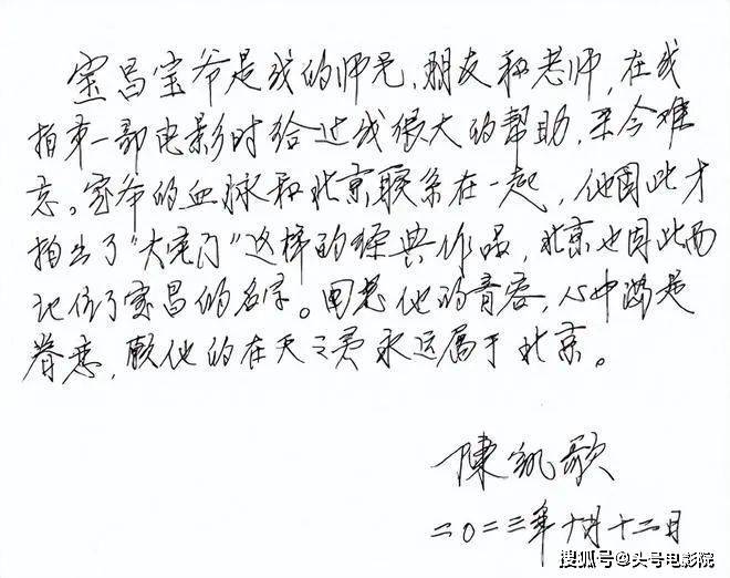 陈凯歌亲笔手写悼文,写道:宝爷的血脉和北京联系在一起,他因此才拍出了《大宅门》这样的经典作品,北京也因此而记住了宝昌的名字。