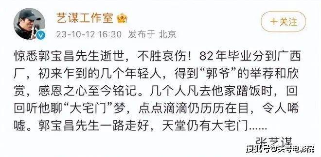 张艺谋提到感恩,追忆道:郭宝昌先生一路走好,天堂仍有大宅门……