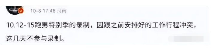 因为态度模糊,又不对看秀事件进行回应,导致原定于10月12日至15日的《奔跑吧特别秀》录制只能取消,当时,杨颖方的解释是,节目录制和此前安排好的工作行程有冲突,不得已缺席。