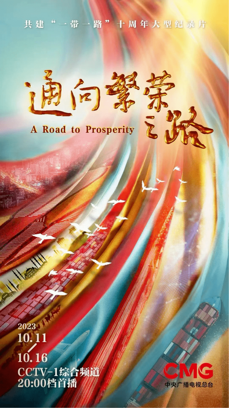 由中央广播电视总台联合推进“一带一路”建设工作领导小组办公室摄制大型纪录片《通向繁荣之路》定档,于10月11日至16日在中央广播电视总台综合频道黄金时段首播,新闻频道、财经频道、中文国际频道、纪录频道等重播。据悉,全片共分六集,分别为“大道同行”、“跨越山海”、“轻关易道”、“心手相连”、“向新而行” 和“和合共生”。