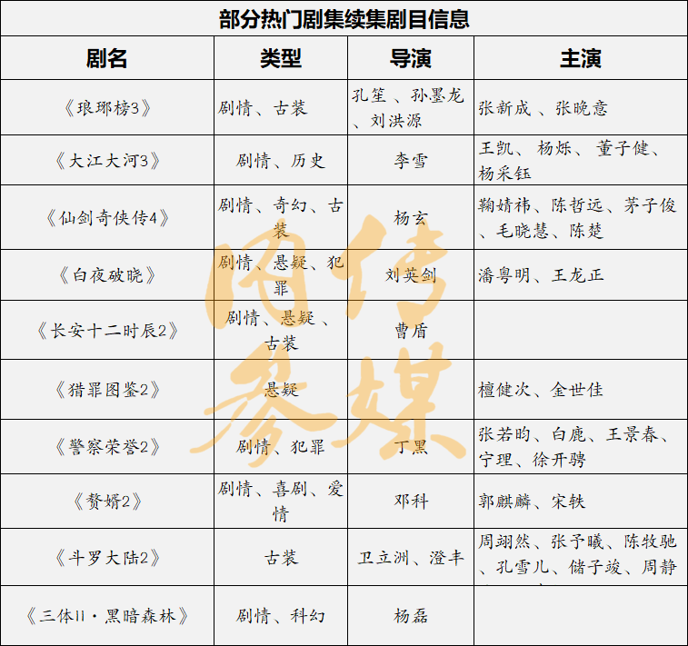 主编温静导读:据不完全统计,目前待播的热门剧续集多达十部以上,重点剧目包括《琅琊榜3》《大江大河3》《白夜破晓》《长安十二时辰2》等。