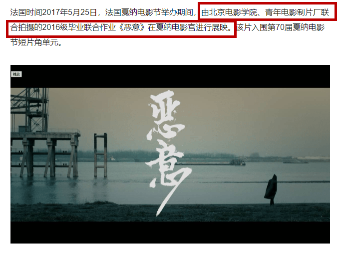 署名万里扬导演的30分钟短片《恶意》,其实是由北京电影学院、青年电影制片厂联合拍摄的2016级毕业联合作业。