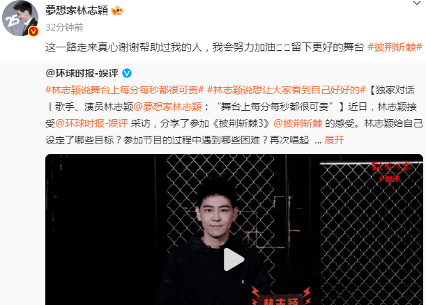 10月12日,林志颖转发环球时报对自己的一段采访视频,采访中正在参加录制《披荆斩棘》综艺的林志颖不仅谈及录制节目的感受,去年经历车祸的他也有聊到自己身体状况以及未来规划。而借着此次采访,林志颖再次感谢这一路走来真心帮助他的人,还表示自己会继续加油,留下更好的舞台。