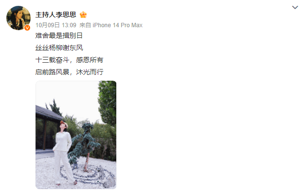 据悉,10月9日,李思思发文回应从央视离职,写道“难舍最是揖别日;丝丝杨柳谢东风; 十三载奋斗,感恩所有;启前路风景,沐光而行。”有网友询问“离职了吗?”李思思回复道:“嗯嗯,开启新的挑战。”