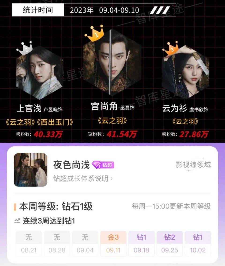 不过,郭敬明还是那个郭敬明,选角眼光让粉丝大呼满意,丞磊、卢昱晓、田嘉瑞等演员凭剧内角色大幅涨粉。根据智库星途数据显示,丞磊一周涨粉41.54万,卢昱晓涨粉40.33万。而且卢昱晓与丞磊的CP势头一路高涨,甚至压过了二搭的虞书欣张凌赫,“夜色尚浅”成为内娱第一个钻2级CP超话。