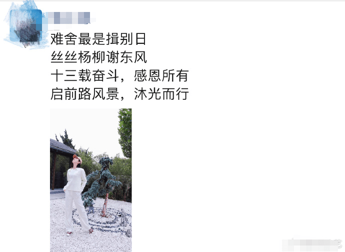搜狐娱乐讯 10月9日,网上传出一张疑似主持人李思思的朋友圈,其中写道“难舍最是揖别日;丝丝杨柳谢东风; 十三载奋斗,感恩所有;启前路风景,沐光而行。”据悉,此前有传闻称李思思已从央视离职,朋友圈这段内容似乎证实了离职传言。 对此,搜狐娱乐有向知情人求证,对方透露李思思很久没出现在央视了,判断已经离开很久。
