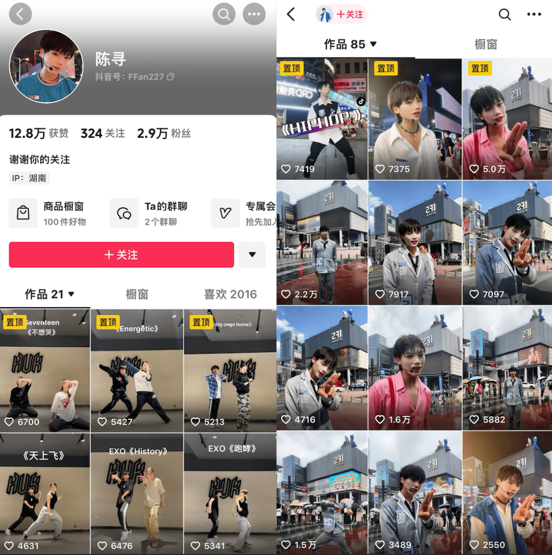 其实刘凌硕还有一个妆容精致的舞室练舞账号。