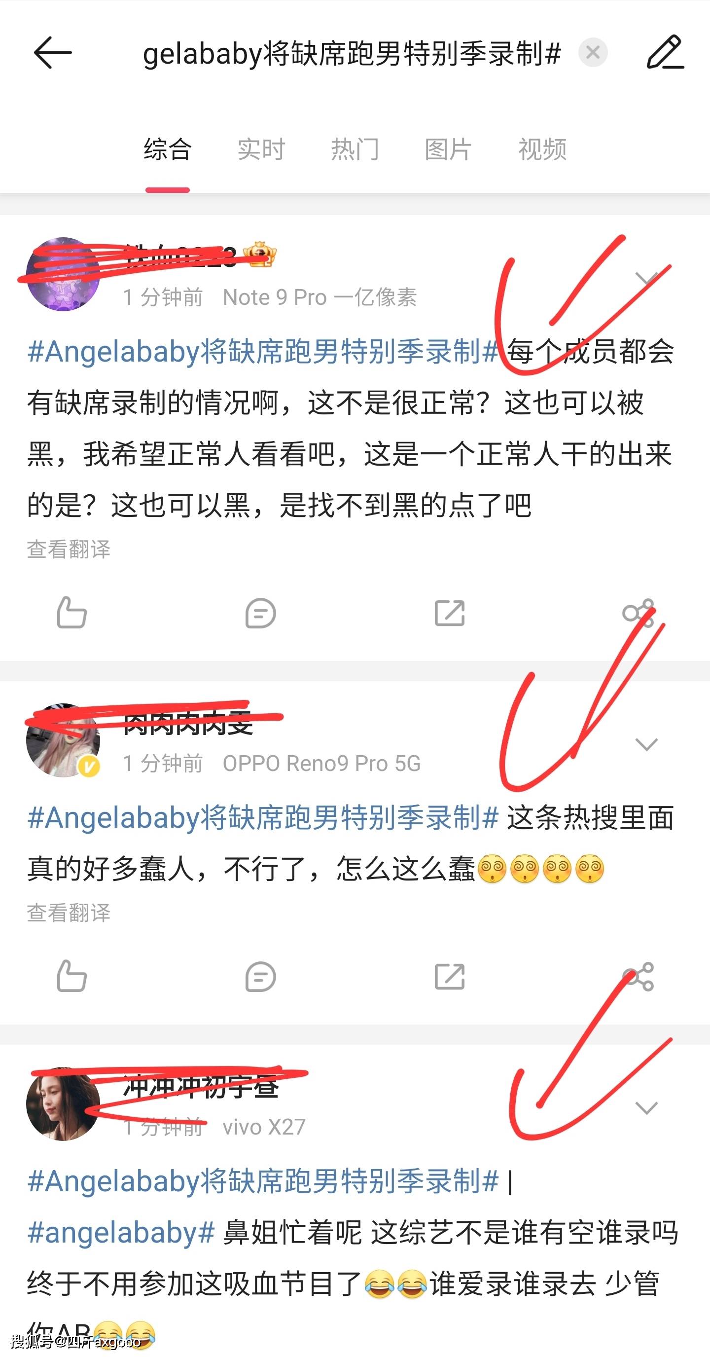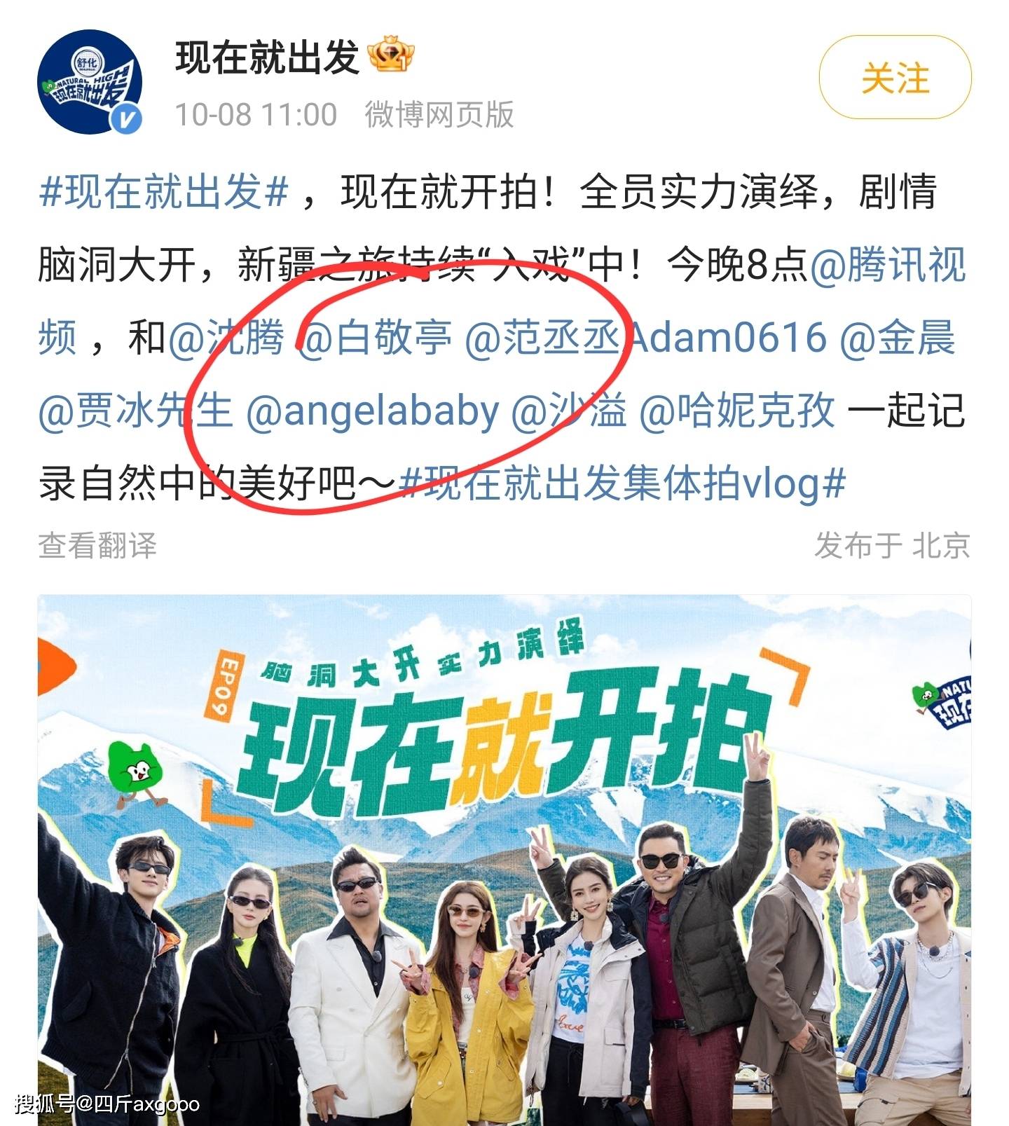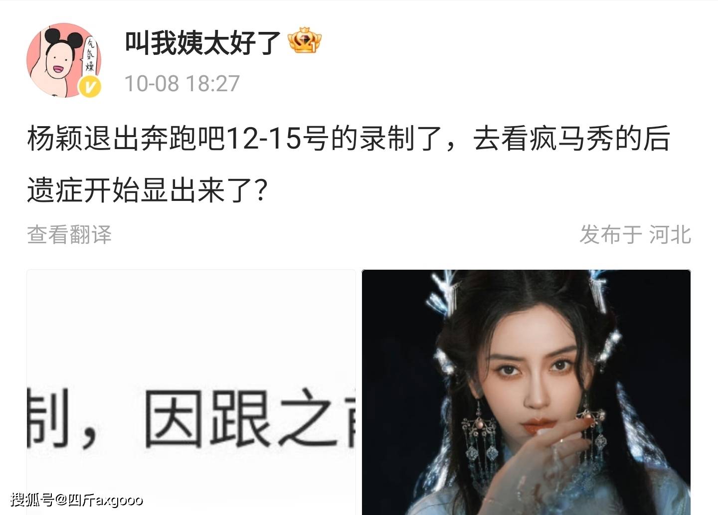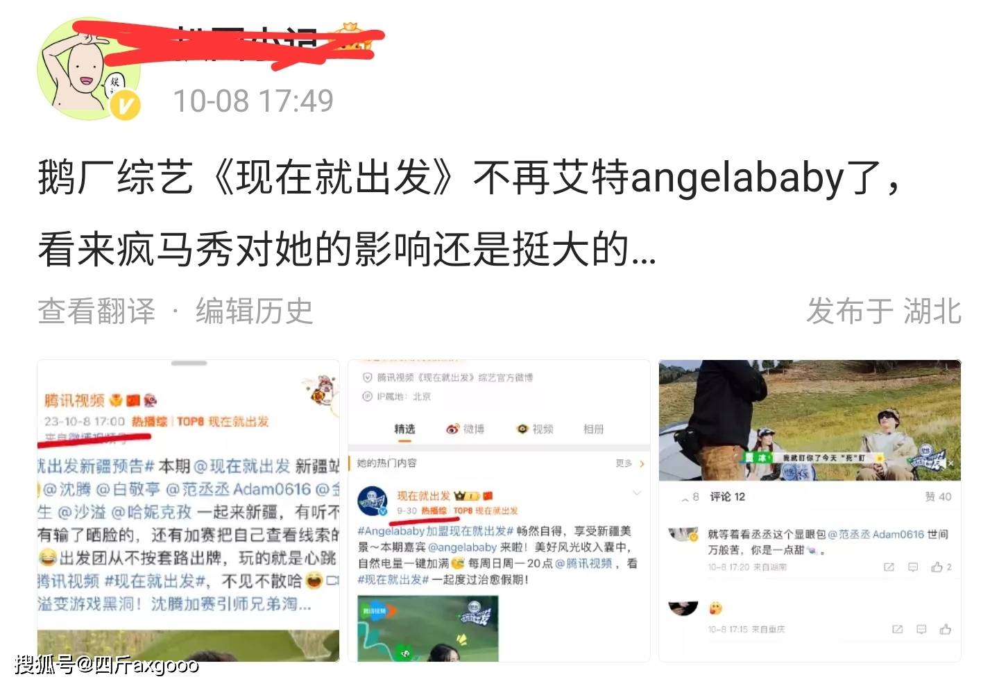 而后又有博主在那爆料说鹅厂的综艺《现在就出发》里面本来有angelababy,结果在angelababy看秀时间发酵以后,现在发布动态都不带angelababy了。