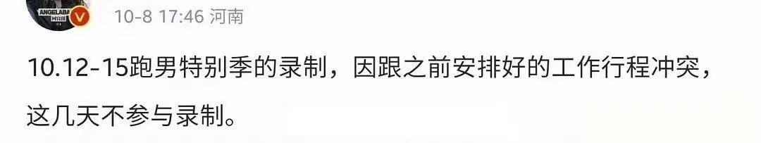 消息的来源,是一位认证是金V的博主,该博主透露,10月12日到15日是跑男特别季的录制,但根据angelababy对接方的消息,因为angelababy“行程冲突”,所以将缺席这次跑男的录制。