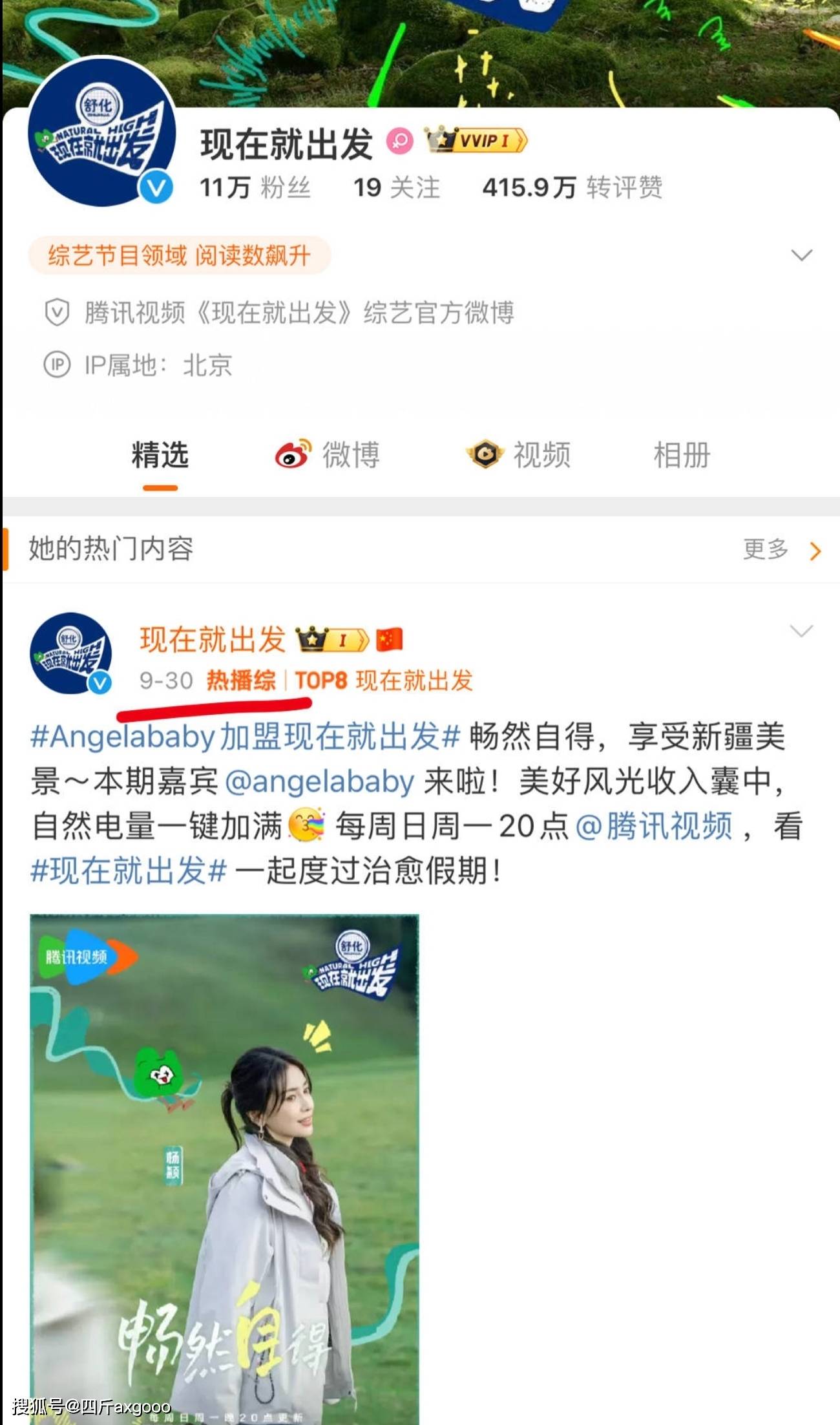 你又别说,我仔细看了一下,这个综艺节目Angela baby的海报真的还在,官方账号也正常发布关于angelababy内容,这说明angelababy似乎真的没有被封杀,也没有被抵制,最起码在鹅厂这块angelababy没有上黑名单。