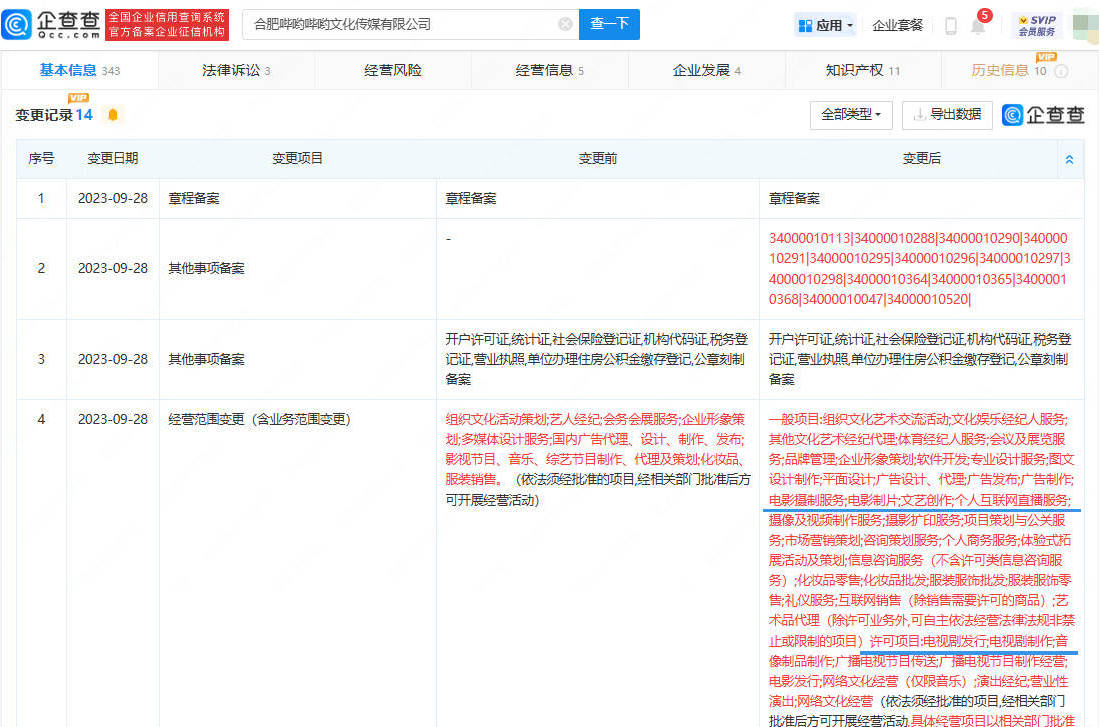 搜狐娱乐讯 10月8日,据企查查APP显示,近日,刘宇经纪公司即合肥哔哟哔哟文化传媒有限公司发生工商变更,经营范围新增电影摄制服务、电影制片、个人互联网直播服务、电视剧发行、电视剧制作、音像制品制作等。企查查信息显示,该公司成立于2019年5月,已注册多枚“刘宇工作室”相关图形、文字商标。