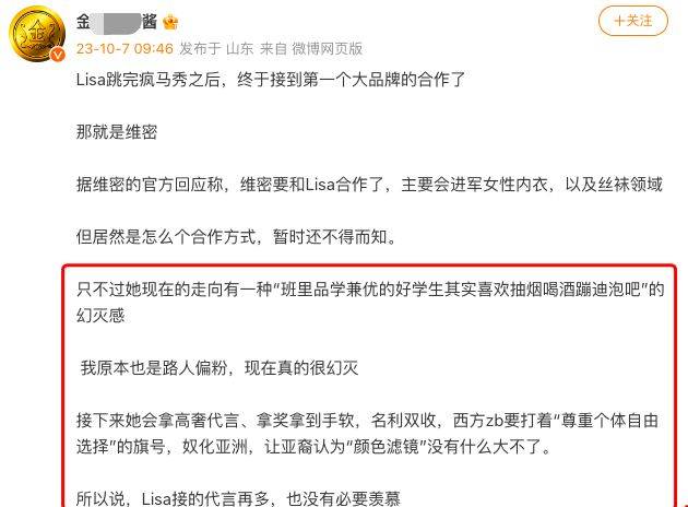 10月7日讯,最近,BLACKPINK成员Lisa跳完疯马秀后,宣布了一项备受关注的合作:她将与维密(Victoria's Secret)合作,主要涉足女性内衣和丝袜领域。这一消息迅速引发了社交媒体和粉丝的热议,以及对Lisa所做选择的多重解读。