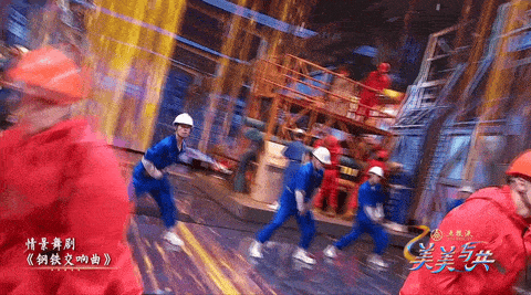 这段表演以打击乐和现代舞为主要元素,将河钢塞钢的历史变迁以一种充满创新的方式呈现在观众面前。一方面,钢架、油桶等变成乐器,美妙的敲击音符在上面律动,钢铁生产的热烈氛围被极尽展现,多层次的声音也为观众带来了音乐上的全新感受;另一方面,身穿蓝色工服和红色工服的舞者一同模仿机器人和机械装置的动作,呈现出刚性、规律和精确的动作,与钢铁生产过程的机械化特征相呼应。3D舞台的视觉呈现,旧钢厂的谢幕与新钢厂的登场充满仪式感,“转变”让人激动不已,整个演出科技感被直接拉满。