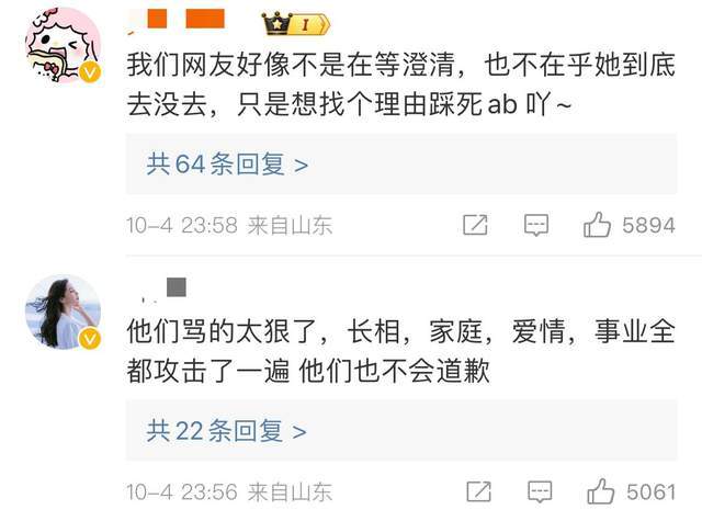 还有网友表示“他们骂的太狠了,长相、家庭、爱情、事业全部都攻击了一遍,他们不会道歉的。”、“澄清了不信,没澄清的时候又说死活不出来澄清,话都被你们网友说了。”