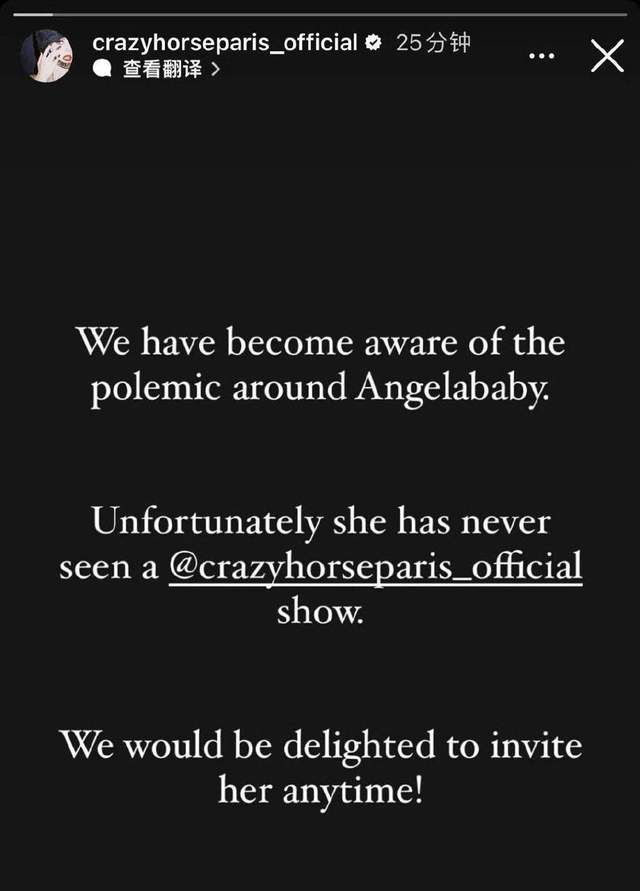 疯马秀在官方发文写道“我们已经意识到了围绕angelababy的争论,遗憾的是她从来没有看过疯马秀,我们很乐意邀请她。”而这也是疯马秀的官方账号,粉丝人数达到了22.5万。
