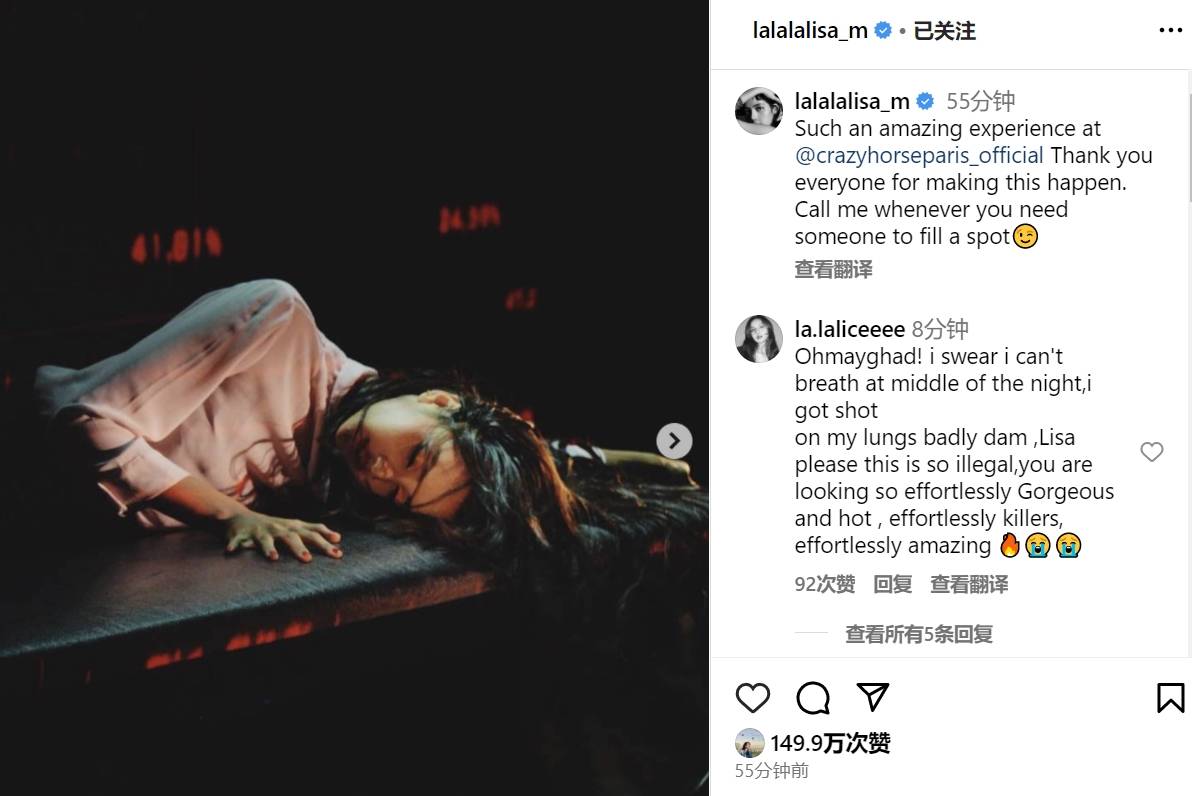 就在全球吃瓜群众都在疯狂寻找Lisa在疯马秀表演时的造型时,北京时间10月5日,Lisa本人竟然在社交账号中直接晒出内场高清美照,配文:“在疯马秀如此美妙的经历,谢谢大家让这发生。 当你需要有人填补空缺时,打电话给我。”,从配图到文案,都如此撩人,令歌迷和网友们不禁感慨:“Lisa,你是怎么敢的!”