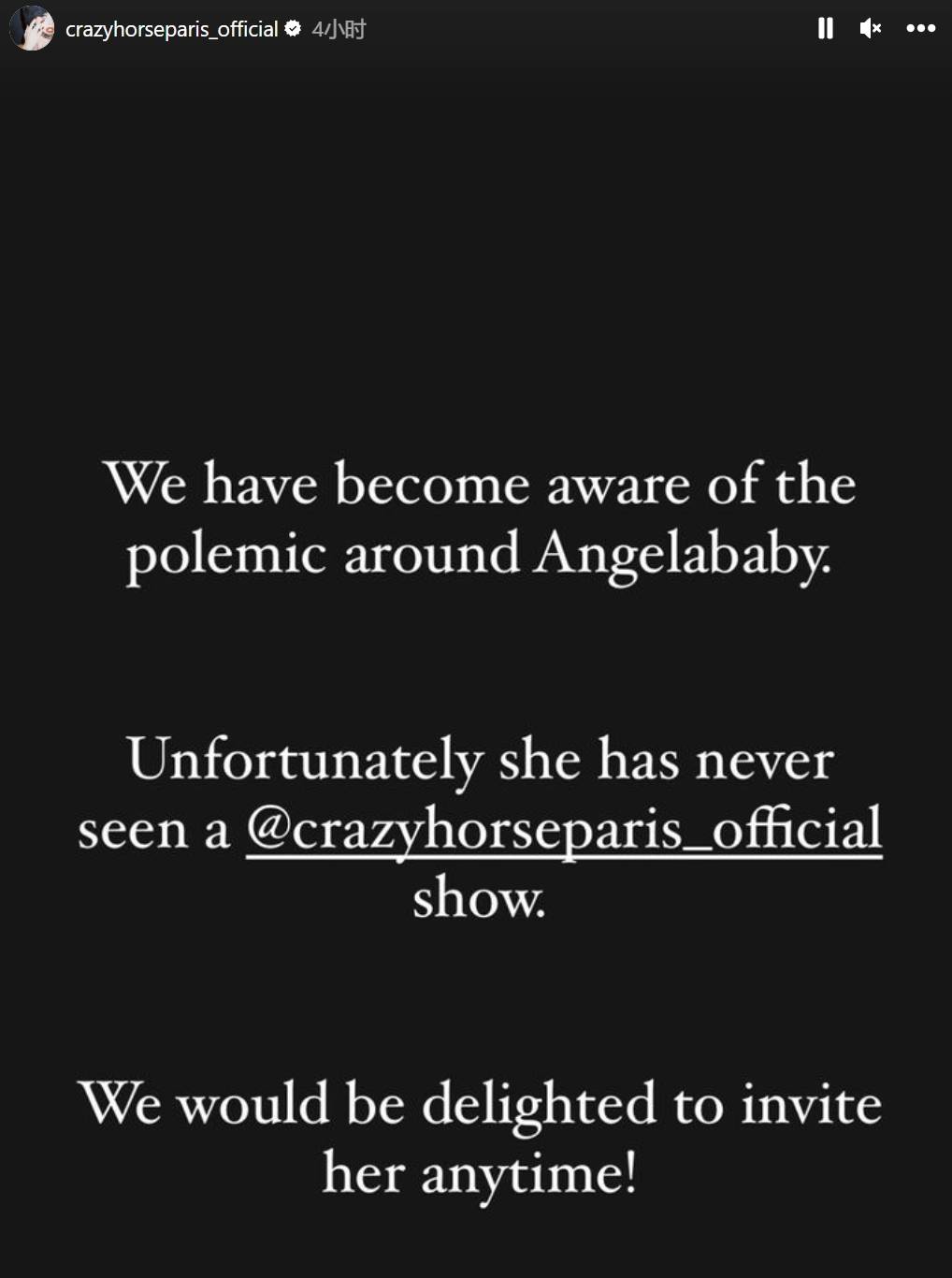 前几天,有传Angelababy也去现场观看演出,并引发抵制热潮。就在10月4日,疯马秀官方账号发文称,他们已经意识到了有关Angelababy的讨论,但她并没有看过,疯马秀愿意随时邀请Baby。算是另辟蹊径帮助Baby辟谣。但直到目前,Baby本人及其工作室并未发声回应,也令事件更加扑朔迷离。