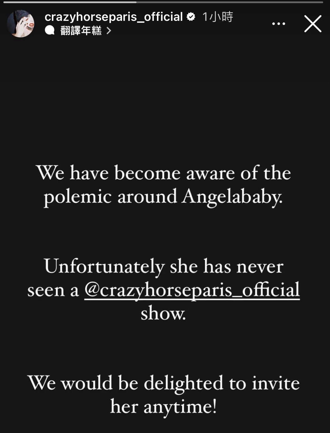 “我们已经意识到围绕着Angelababy的争论。不幸的是,她从来没有看过疯马秀的官方节目,我们很乐意随时邀请她。”