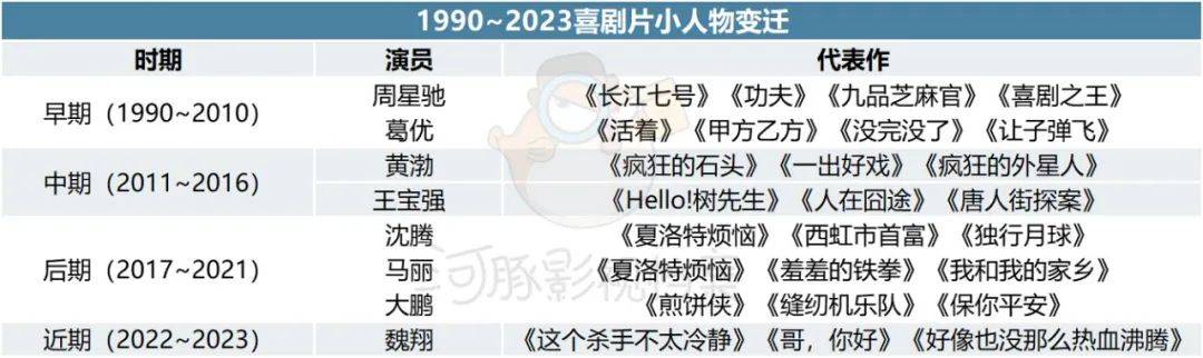 为了详细梳理喜剧片小人物的变迁,小娱查阅了猫眼专业版的资料库,将1990~2023扮演此类角色的经典喜剧演员大致分为早期、中期、后期、近期四个时期。