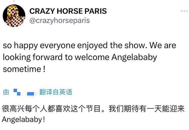 北京时间10月4日,angelababy观看疯马秀事件持续发酵,疯马秀官方媒体在社交媒体上回应网友“很高兴每个人都喜欢这个节目,我们期待有一天能迎来angelababy。”