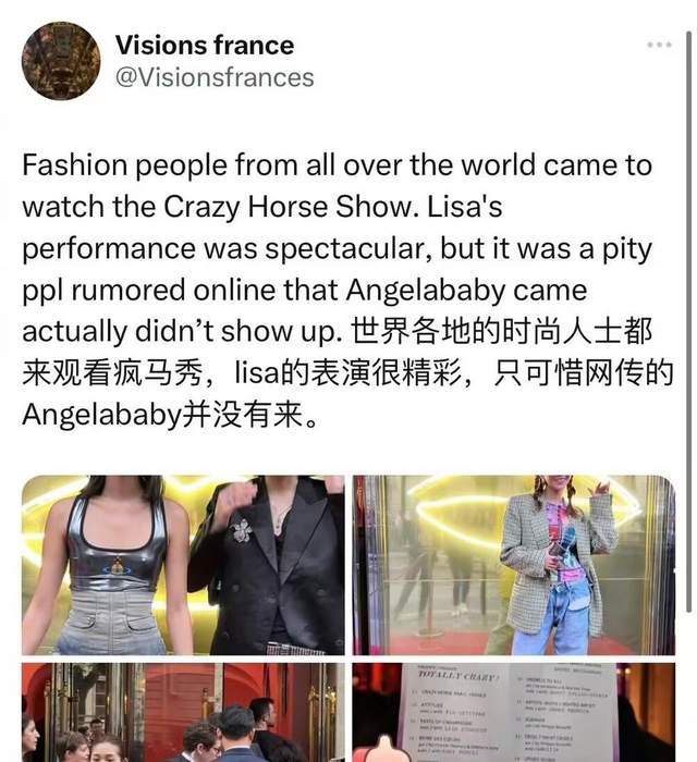 而且该官方回复的账号写道“世界各地的时尚人士都来看疯马秀,lisa的表演很精彩,只可惜网传的angelababy并没有来。”