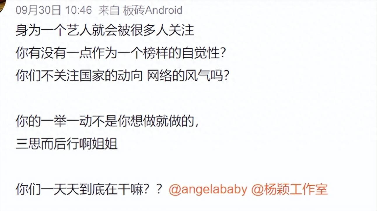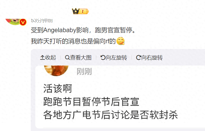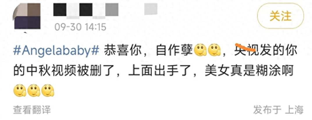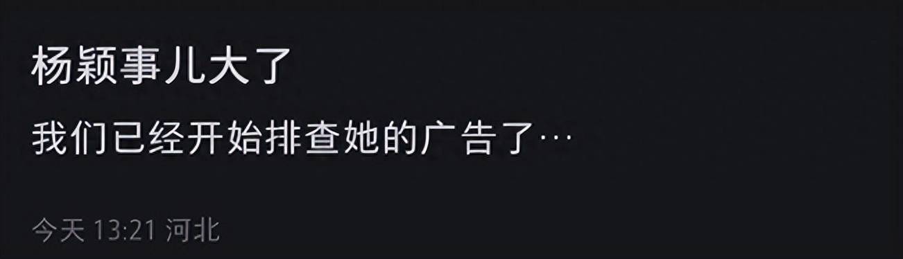 风波发生之后,央视三农官微删除了中秋发布的baby的视频,也有网友透露节后baby的节目官宣会暂停,各地在讨论是否软封杀;还有人爆料称“杨颖事儿大了,我们已经开始排查她的广告了”。
