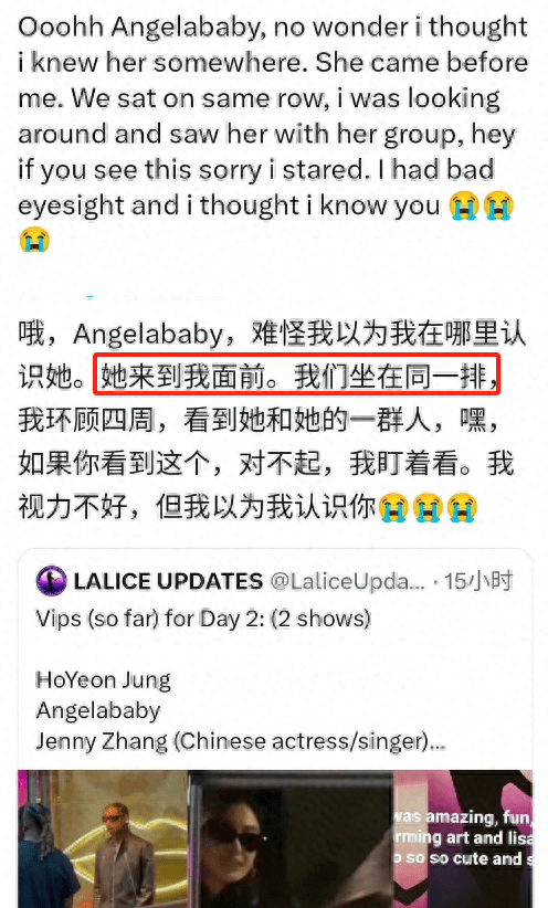 就连外国网友也出来爆料说在内场看到了Angelababy,和她坐在同一排,外国网友因为baby长得眼熟还盯着她看了一会儿。