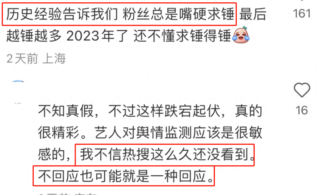 也有清醒的网友表示按照现在内娱的塌房规律,不回应就相当于默认了。但无论如何,baby作为公众人物,坐拥上亿粉丝,事情发生了却不出来面对,不能给粉丝正确的引导,不能带动正向的网络风气,是严重的偶像失格。建议还是尽早出来面对争议,给大家一个清朗的网络环境吧。
