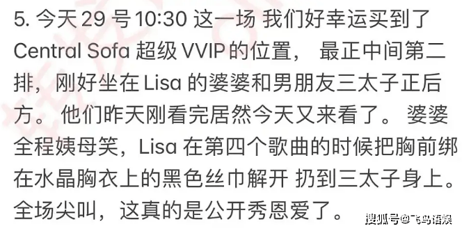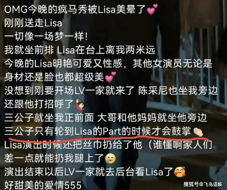 根据观众的现场反馈,Lisa的婆婆全程是笑着看完秀的,而LV三公子却全程十分淡定,只有在Lisa这个部分才鼓掌。而且在Lisa演出的时候,把胸前黑丝巾扔给了三公子,作为回应LV一家也在结束后在后台看Lisa。