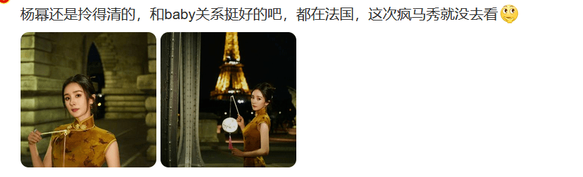 说杨幂在出席巴黎时装周的时候将瓷器赠与外国友人,穿着旗袍在埃菲尔铁塔下拍照,非常的正能量,跟看疯马秀带偏粉丝的baby高下立见,吐槽baby活该进不了85花。