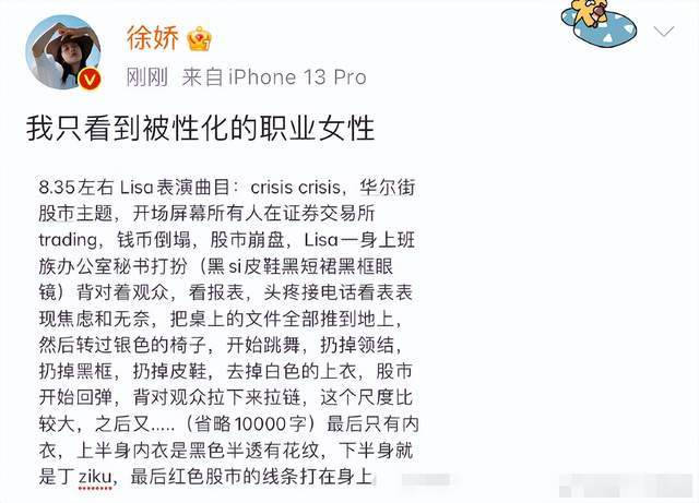 不过徐娇的抨击却遭到了很多Lisa粉丝的攻击,不少lisa粉丝在外网表达对徐娇的不满,更直言没去看过疯马秀,就在网上指指点点,言外之意是认为徐娇没这个资格。