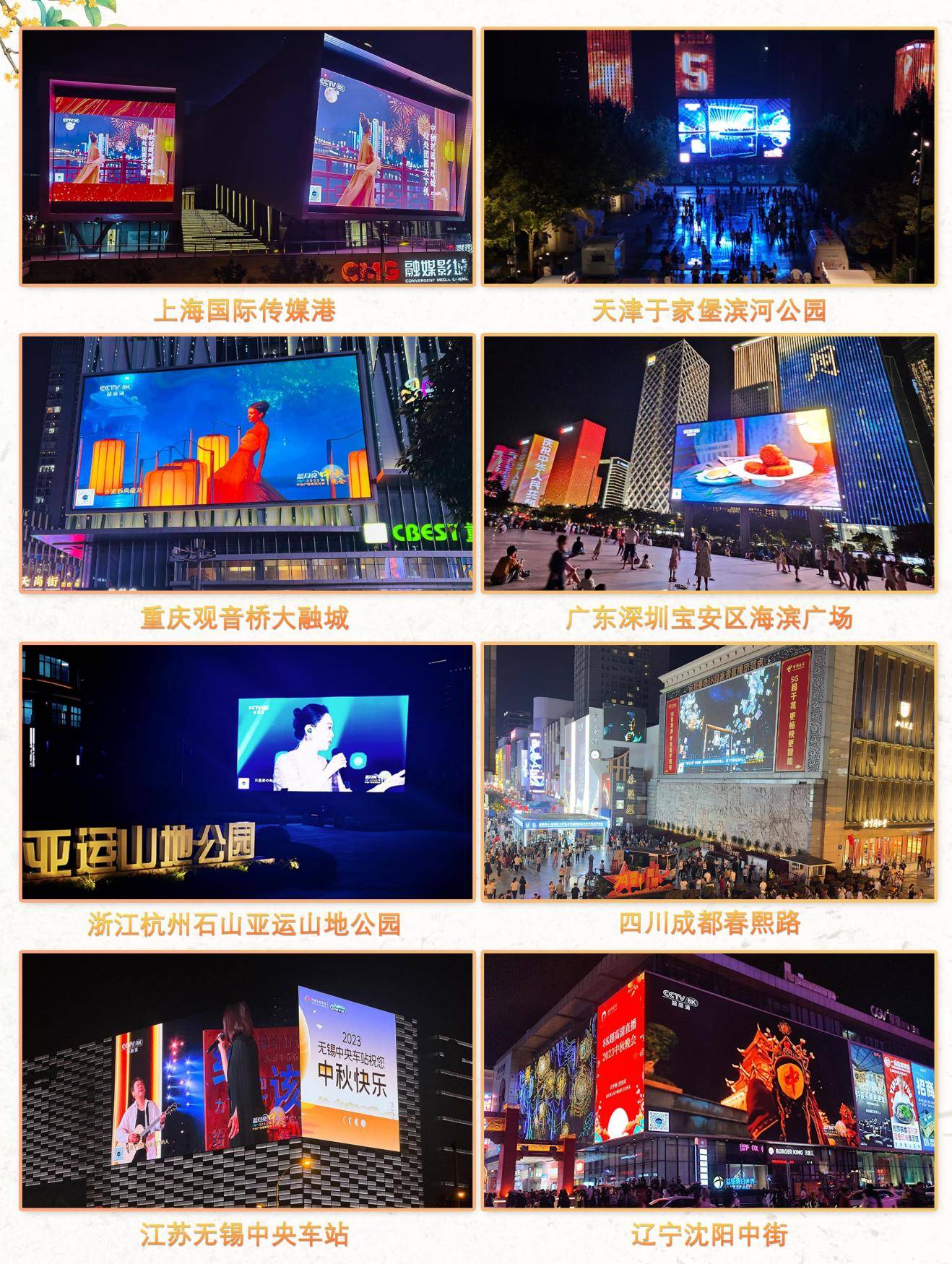 在全国90个城市的710余块户外地标大屏,市民通过总台“百城千屏”欣赏了8K超高清版本的中秋晚会。在通过云听收听三维菁彩声的烘托下,画面更逼真,音画层次更立体分明。这是继9月23日杭州亚运会开幕式后,“百城千屏”给广大市民朋友送上的又一别样中秋之礼。云上之月与屏中之月交相辉映,为城市公共文化生活再添一抹诗意。现场观众表示“在户外看大屏,边看晚会边赏超级月亮,这样的中秋别具一格!”