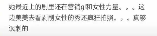 毫无疑问的,张嘉倪和杨颖这次去看秀,一定会再次带动一批粉丝接受疯马秀“艺术”。事实上这样的演出就是一场彻彻底底的“阶级审视”,张嘉倪和杨颖这样的208万无疑是在上层阶级,所以她们根本不在乎普通女性的感受,也自然不会觉得身为女性被侮辱,因为她们享受到了作为上层阶级俯视下位者的快乐。