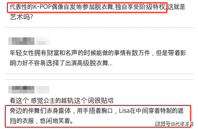 Lisa的疯马秀首秀受到吐槽的最大原因,就是她打着艺术的幌子,利用自己的影响力试图给“跳脱衣舞”洗白成“身体自由”。结果到了实际演出,她又使用自己的特权穿着加了面料的服装,丝毫不肯暴露,站在一群近全裸的伴舞中间,表演给台下的有钱有权者看。