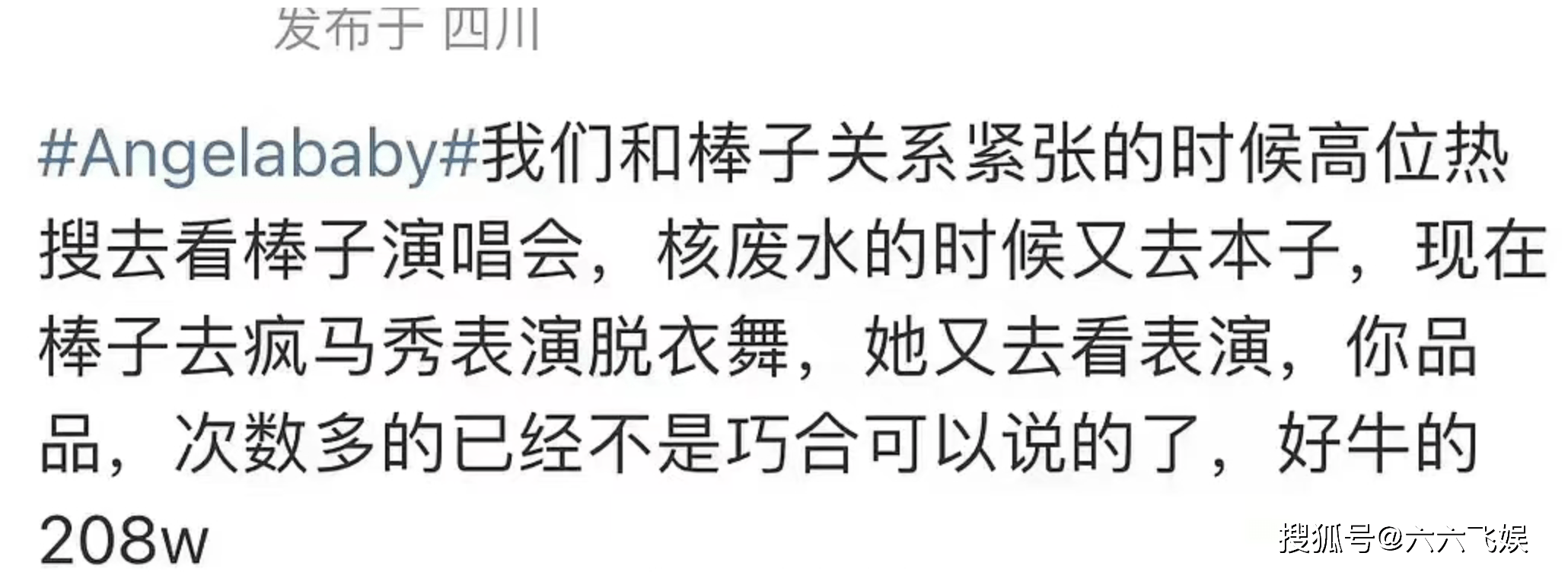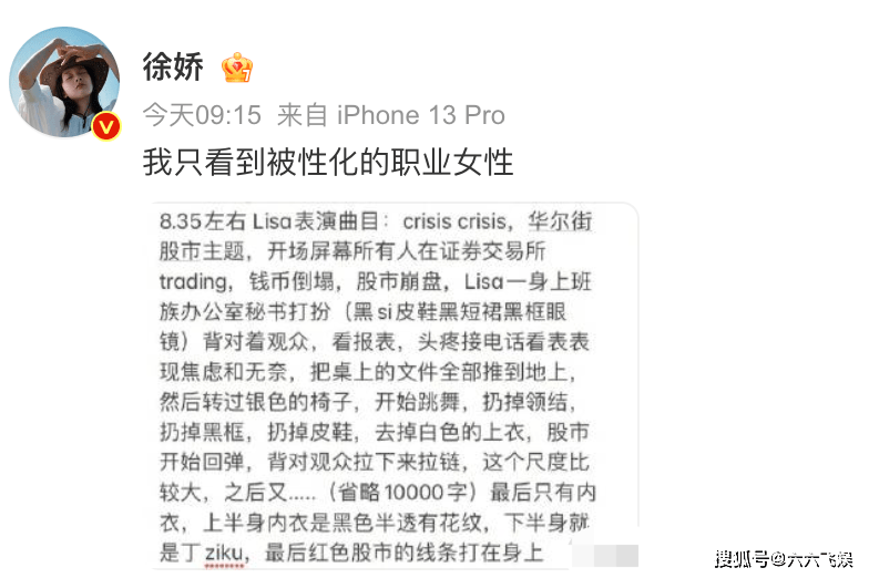 “星女郎”徐娇看到网友发的描述Lisa表演的内容,给了一句评价:我只看到被性化的职业女性。