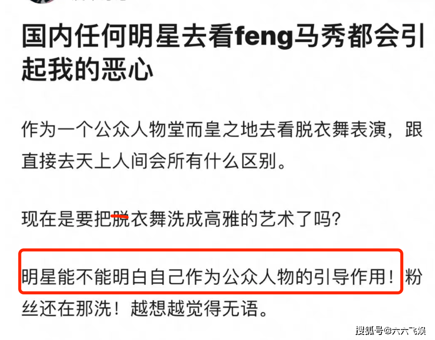 网友认为,公众认为应该清楚自己的引导作用,一个明星跑去看这种表演,和去天上人间会所没区别。