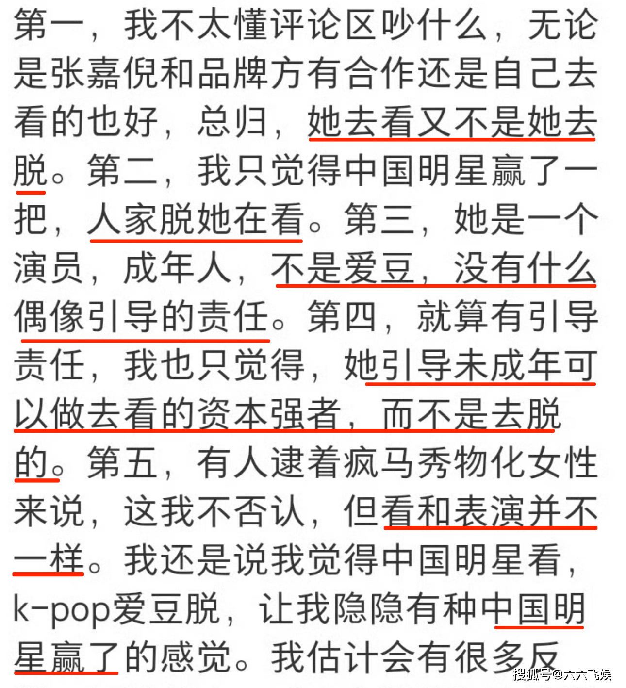 这位网友洋洋洒洒看似逻辑清晰有力的小作文里,总结起来就是:张嘉倪不是爱豆没有偶像引导责任,她是去看,她代表的是资本强者,赢了。