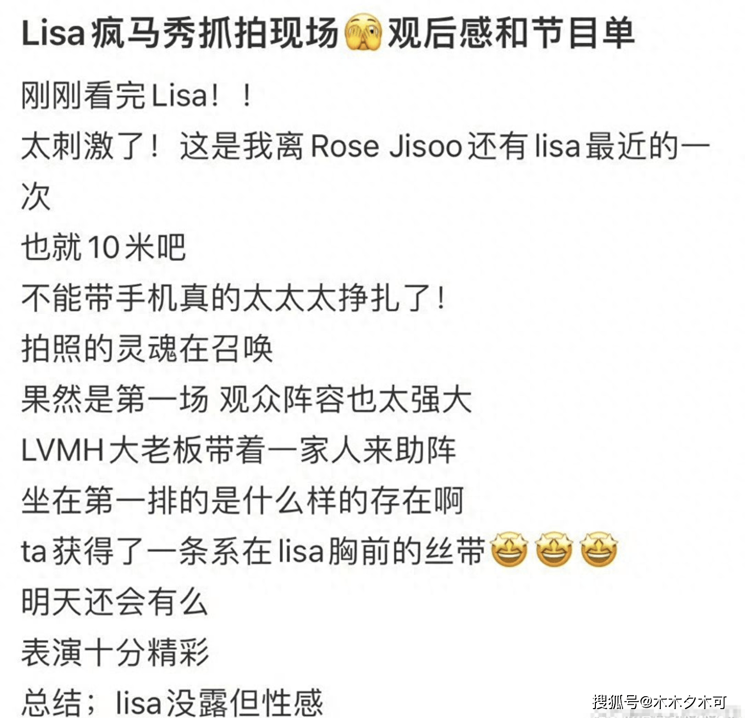 只是这么一场备受瞩目的大秀,现场不可能被保护的一丝不漏,lisa的造型还是被人给发到了网上,据现场观众看完表演后出来分享,lisa一共是出场了6次,而且还在现场独自solo了两首曲子,一首俏皮可爱,一首性感妩媚,总共加起来出场大约15分钟,而且lisa现场人气很高,但凡出场就会引发全场尖叫。