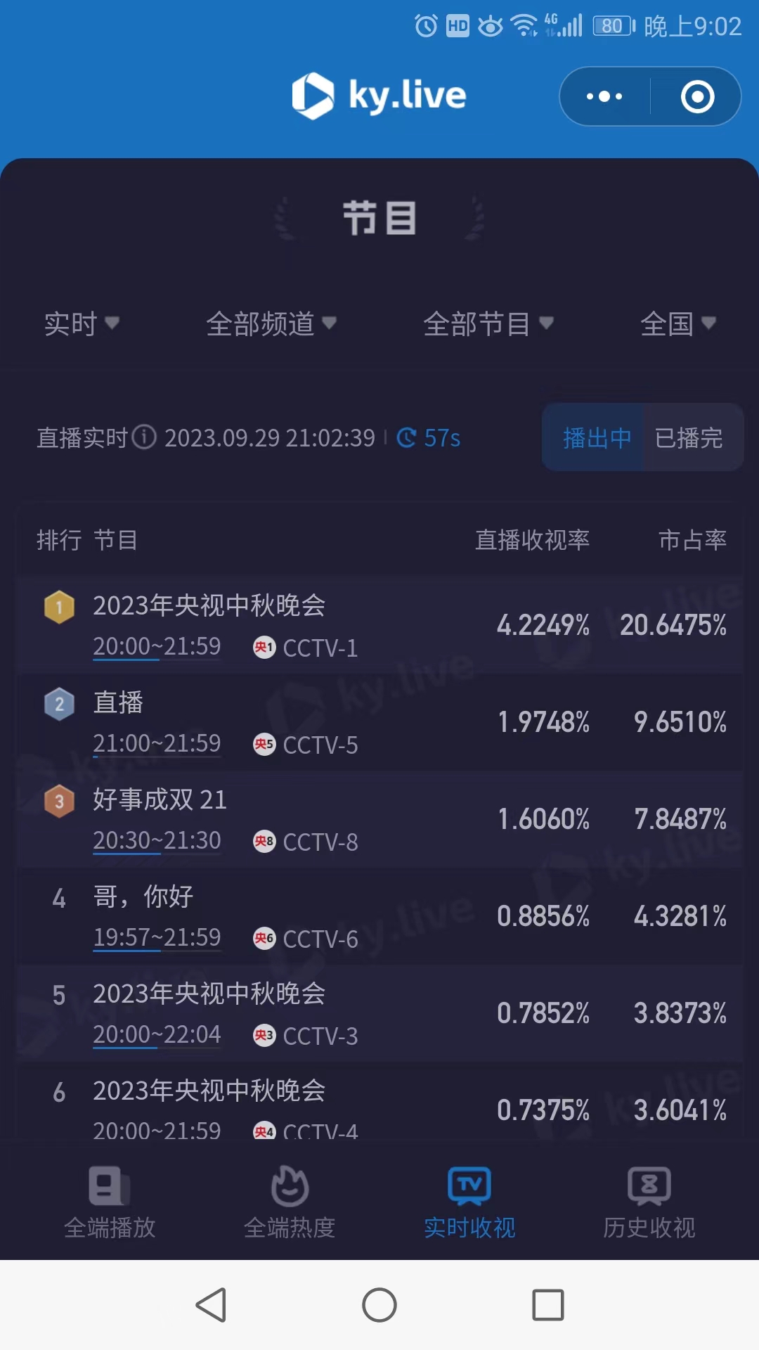 我们从酷云实时截取了当晚9点前后的三家晚会的实时收视率数据。这个时刻,央视中秋晚会在一套、三套和四套等多个平台播出。央视一套的实时收视率是4.2249%,央视三套的实时收视率是0.7853%,央视四套的实时收视率是0.7375%。值得注意的是,央视中秋晚会,还在其它平台播出。