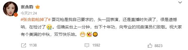 张含韵表演节目时意外耍掉了手中的长枪道具。随后张含韵发文回应:很是遗憾呐,在检讨了。