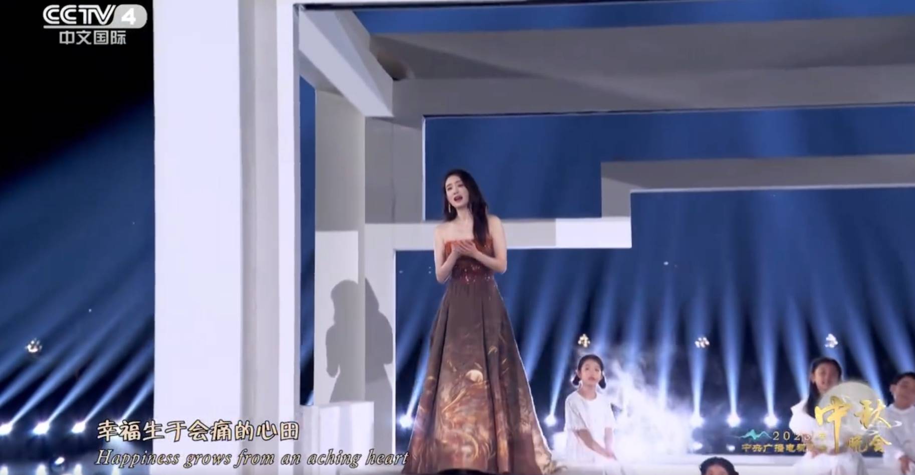张小斐穿一身云锦高定精彩亮相,气色红润,和孩子们一起合唱了一首《天之大》。