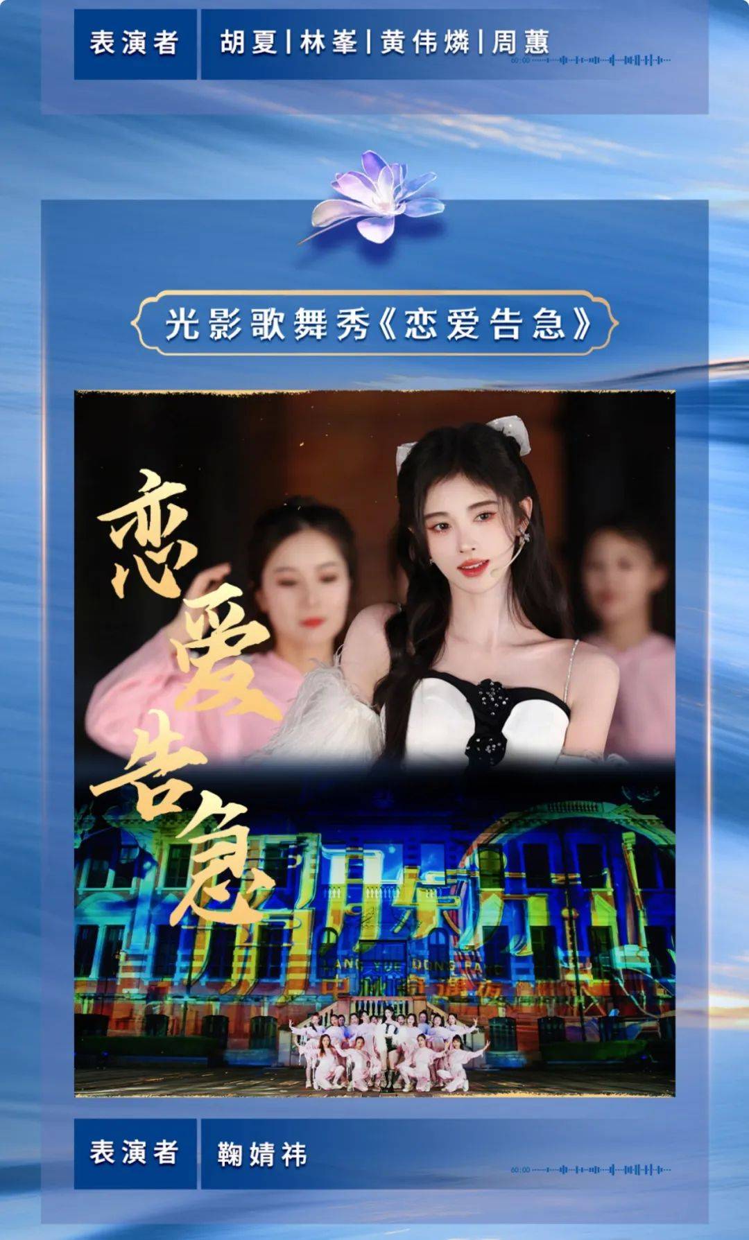 值得一提的是,观众还将跟随主持人行走在静安国际光影节的地标装置之间,领略光影夜上海的创意和惊喜。光影歌舞秀《恋爱告急》以上海总商会大楼MAPPING光影秀为背景,通过AI二次元形象作为引幻化出艺人鞠婧祎,并采用MOCO拍摄技术手段使鞠婧祎在同一舞台时空中展现多个分身,给观众带来意想不到的视觉冲击。