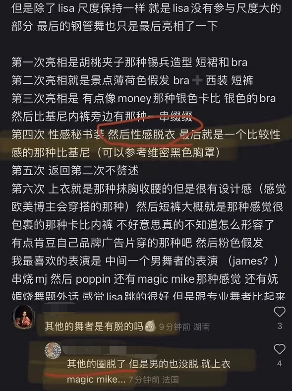 因为现场对手机的管控非常严格,只有零星几张流出的照片,大部分的现场情况还是靠进了疯马秀现场的观众回来爆料。从现场许多观众的叙述中可以得知,Lisa当晚一共出场6次,每一次都有不同的装束,其中第4次出场的黑色比基尼就是她全场尺度最大的装扮。