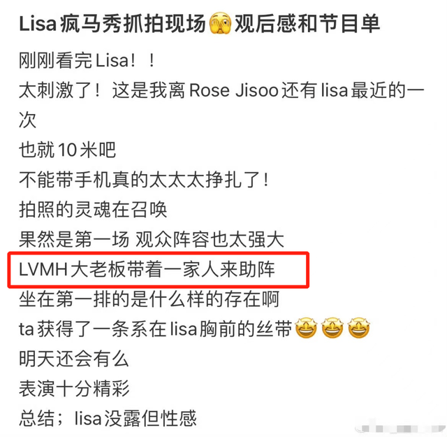 不过更加重量级的来宾就是LVMH集团的大老板了!也就是Lisa绯闻男友LV三公子的爸爸,有现场网友爆料,大老板带着全家人到了现场,三公子笑的超级甜,看着自己的女朋友热舞非常开心。
