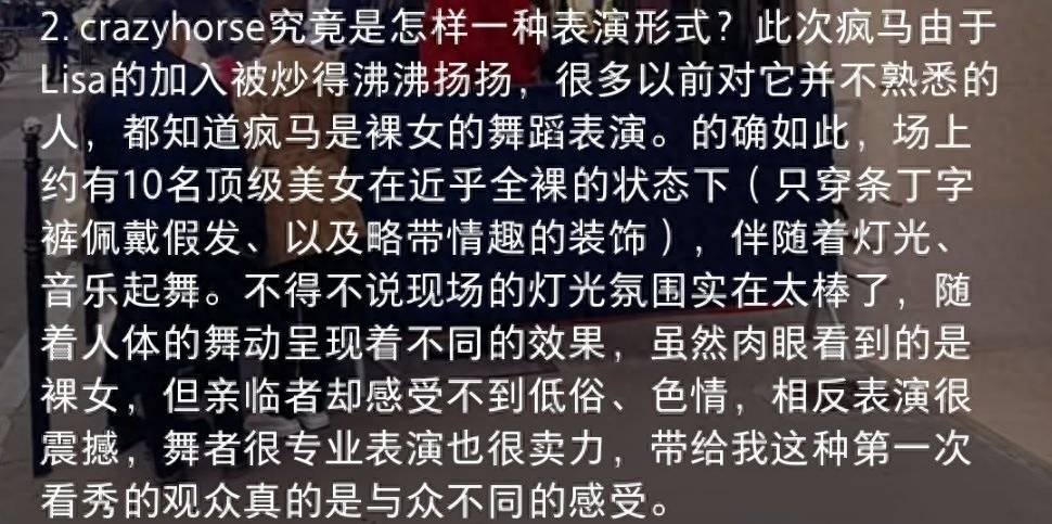 原标题:Lisa疯马秀演出画面曝光,全裸上身尺度大,出场6次有脱衣行为