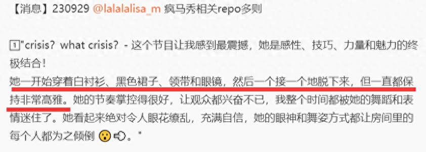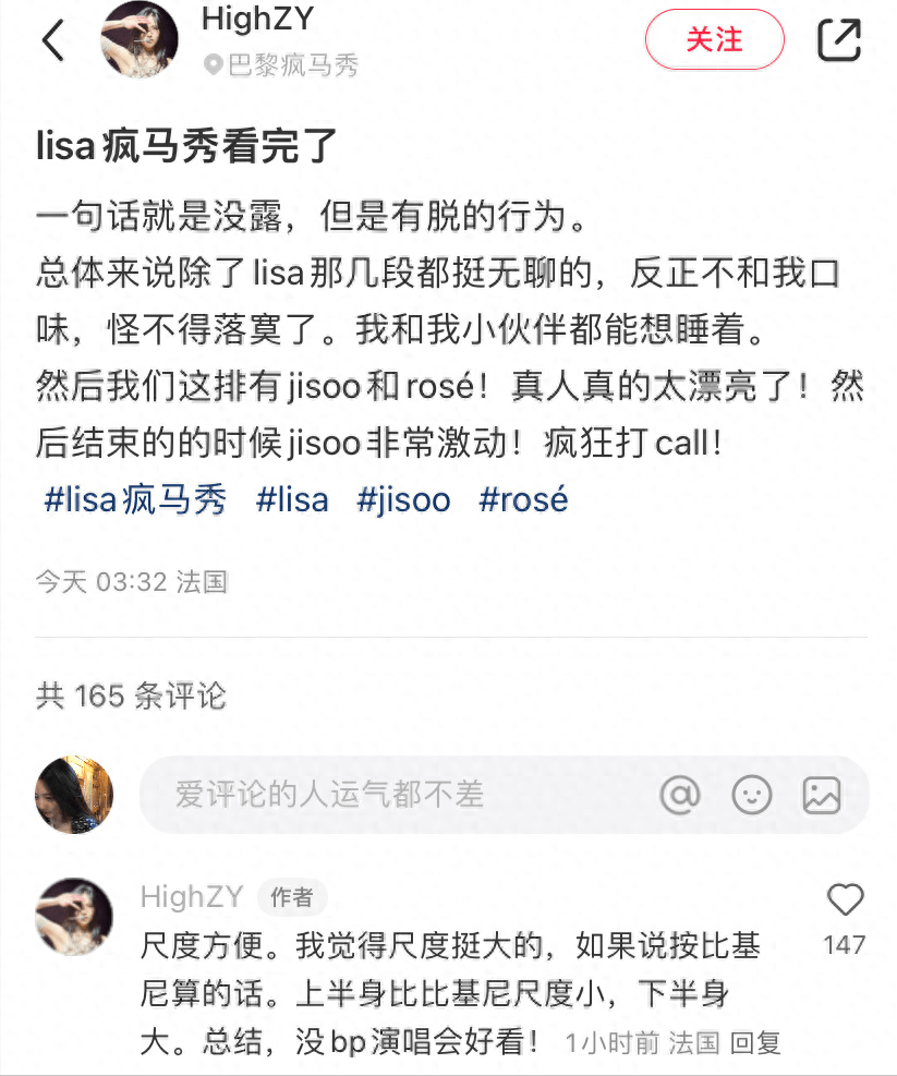另两位观众透露,Lisa有脱衣的行为,她一开始穿的是白衬衣、黑色裙子、领带和眼镜,登台后一个接一个脱下来,但一直保持着优雅,如果按比基尼算的话,上半身比比基尼的尺度小,下半身大,总结就是没有演唱会好看。