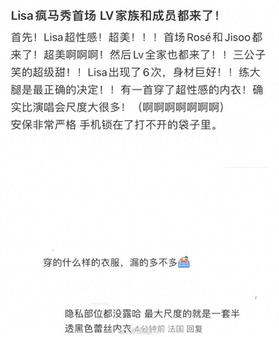 还有观众透露,Lisa总共独舞了两首曲子,一首性感妩媚,一首俏皮可爱,每首约3-4分钟,加上谢幕出场大约15分钟,穿着方面比其他舞女保守多了,但比演唱会尺度大,内衣底裤都包裹的很严实,不过从曝光的照片看,Lisa上身确实没穿衣服,但是亲临者没有感受到低俗,相反表演很震撼,舞者很专业也很卖力。