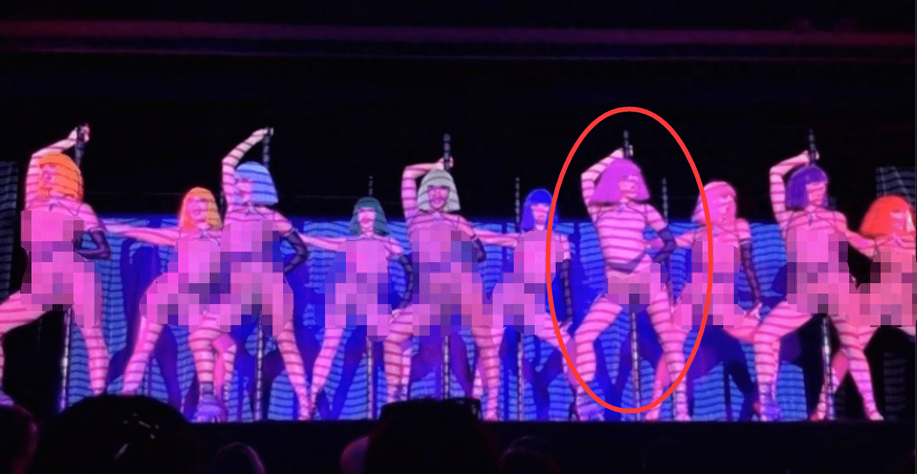 不过,Lisa演出的画面还是被曝光了出来,照片中,Lisa的造型有些诡异,戴着一顶帽子被打上了绿光,暴露的地方都没穿衣服,因为尺度大,所以曝光者给Lisa打码遮掩。