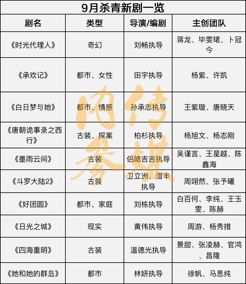 以下是CMNC—传媒大眼梳理汇总的9月杀青新剧信息: