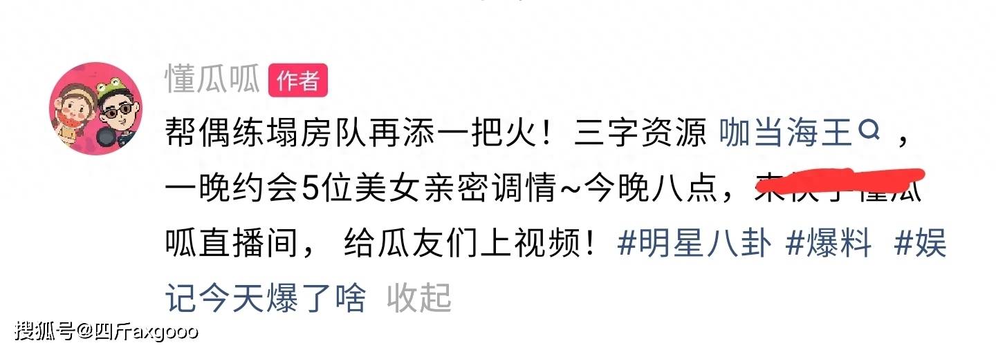 所以你看,懂瓜呱说要曝光男偶像约会五位美女的事情,真正的瓜可能相当劲爆,但如果发生了一些蝇营狗苟的交易的话,最后爆出来的不一定是谁呢,我都怀疑他都好意思拿出一个偶像练习生50名开外的素人选手来说事。